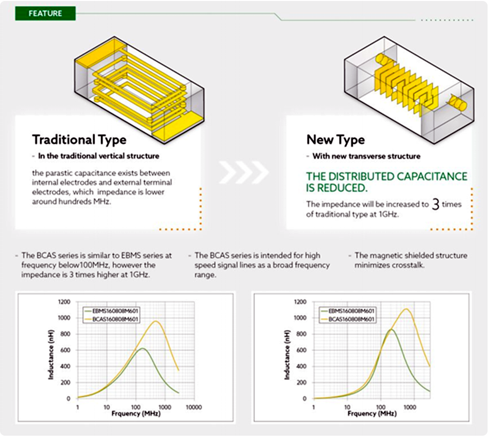 By improving printing technology and internal structure, BCAS series can be used in GHz High Frequency noise suppression.