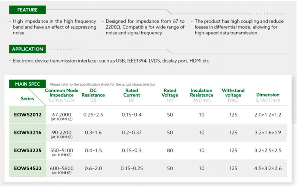 The EOWS series common mode filter utilizes ferrite material and wire wound design structure which is for suppression common mode noise.