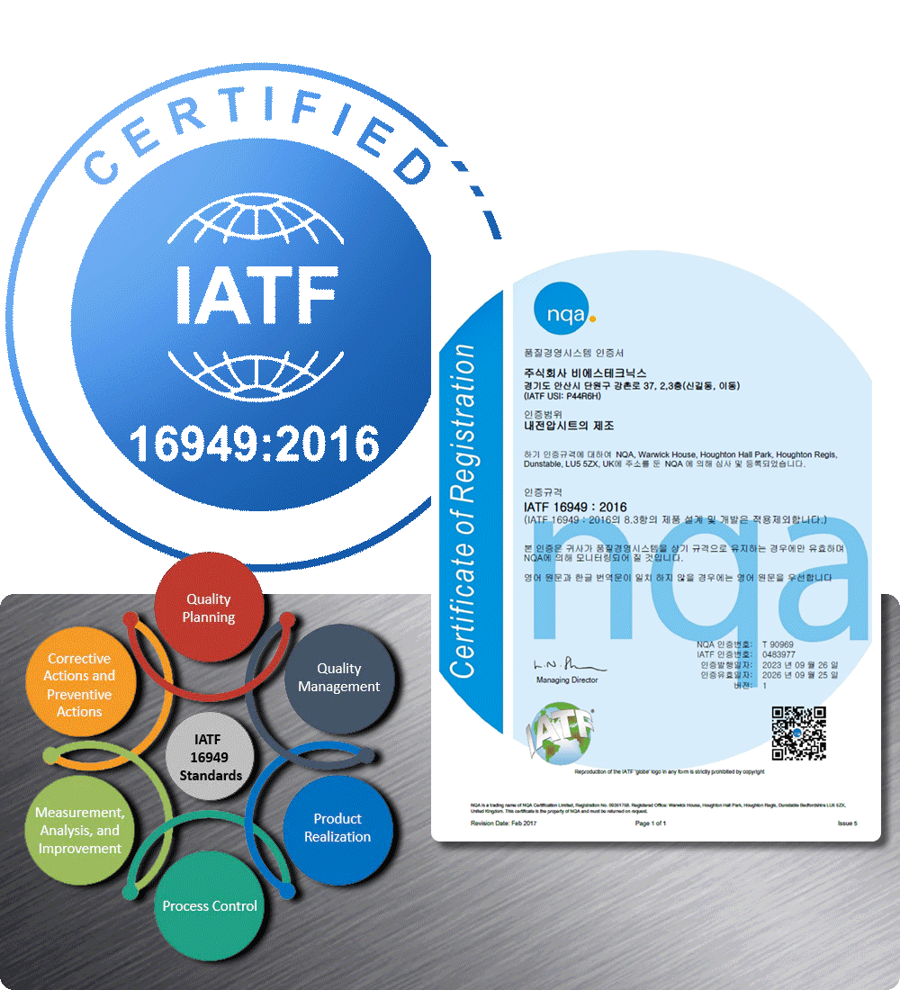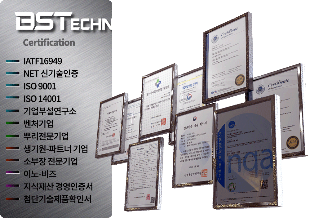 International quality management system certifications are highly demanding, and the process to obtain them is time-consuming. BSTECHNICS has achieved certification in the specialized high-voltage seat components for electric vehicles. This certification is significant in strengthening competitiveness, improving quality, and meeting legal requirements. It represents a crucial first step in gaining global recognition and provides an advantage in transactions with major automotive manufacturers. In some countries, IATF 16949 certification is required for automotive parts, making it essential for meeting legal obligations and a critical requirement. Through this, BSTECHNICS enhances customer trust, improves efficiency through process improvements and cost reduction, and gains favorable conditions for global expansion.